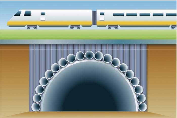 The aim is to create a full support structure prior to doing any of the major excavation. This can be done by using jacking, microtunnelling or pipe ramming methods to form an advance support structure. The illustrations shows a series of interlinking tubes installed by microtunnelling to form the support structures for an arch and rectangular structure.. Frequently an arch structure is created but virtually any shape is possible. The interlinking steel tubes which form the support canopy are filled with reinforced concrete. Once the main excavation starts additional internal framing is installed as work proceeds to support and complete the structure. This technique has been used for the construction of large underground structures such as metro stations.